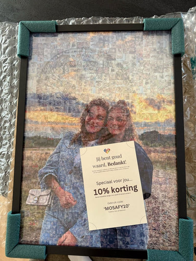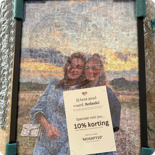 Welke formaten en oriëntaties zijn beschikbaar? Onze mozaïeken zijn verkrijgbaar als poster, poster met fotolijst én als fotopaneel. Zo kies je altijd wat past bij jouw ruimte en stijl. Fotopaneel (modern & strak): S: 40,6 × 60,6 cm M: 60,6 × 90,6 cm L: 80,6 × 120,6 cm Het fotopaneel wordt direct op een stevig paneel gedrukt en is klaar om op te hangen, zonder lijst. Poster & fotolijst (papier): Onze posters zijn verkrijgbaar in de formaten A3, A2 en A1, en kunnen zowel met als zonder lijst worden besteld. De fotolijst geeft het mozaïek een warme, tijdloze uitstraling. Voor alle varianten geldt: je kunt kiezen voor staand of liggend, afhankelijk van je foto en waar je het mozaïek wilt ophangen. Zo zorgen we samen voor het mooiste resultaat.